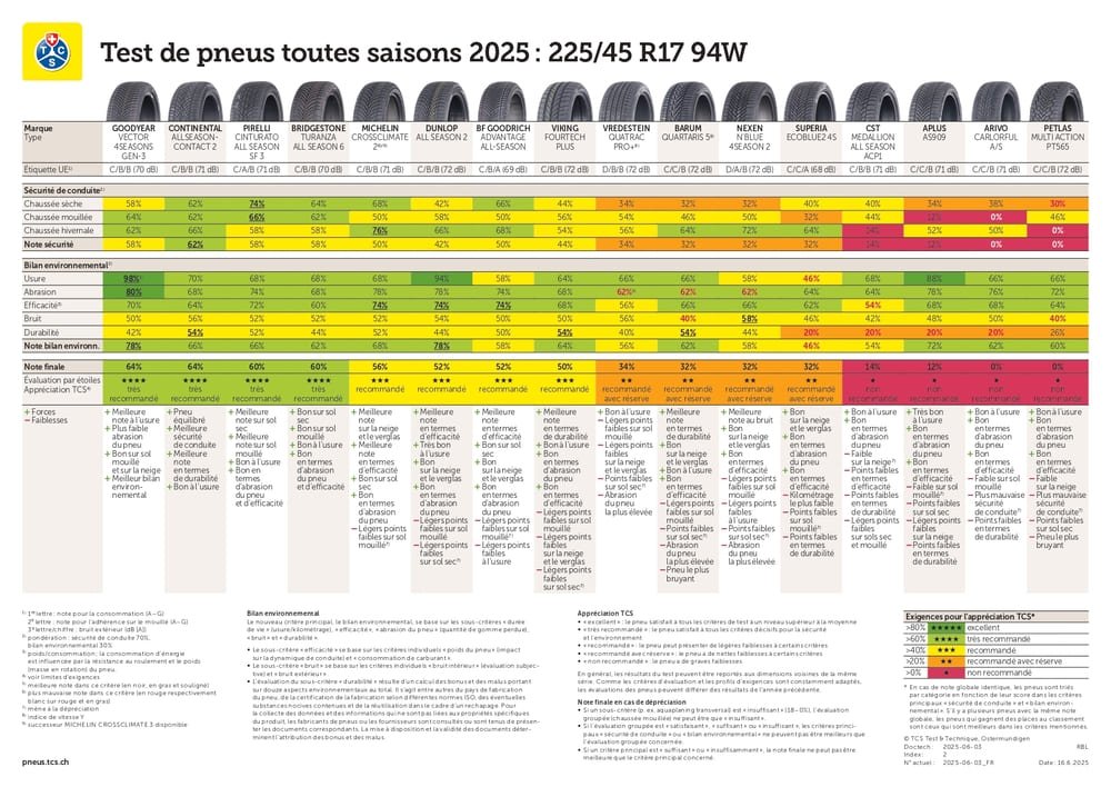 Pour la saison 2025, le Touring Club Suisse (TCS) a réalisé un comparatif rigoureux portant sur 16 modèles de pneus toutes saisons. Ce test de référence qui évalue des critères tels que la sécurité sur sol sec, mouillé et enneigé, ainsi que l’impact environnemental (usure, consommation, bruit), est pleinement valide pour l’année 2026.